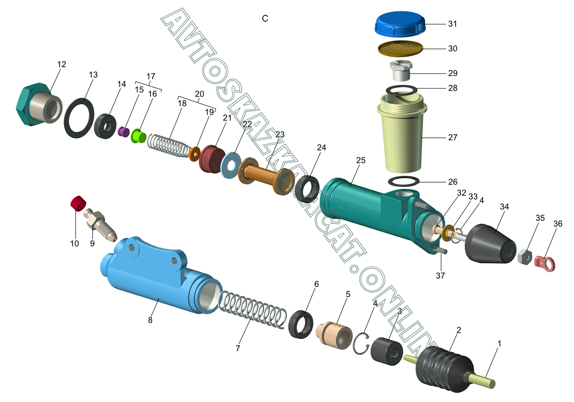Детали главного и рабочего цилиндров привода выключения сцепления ГАЗ 2705 (с двигателями ЗМЗ-402, 406)