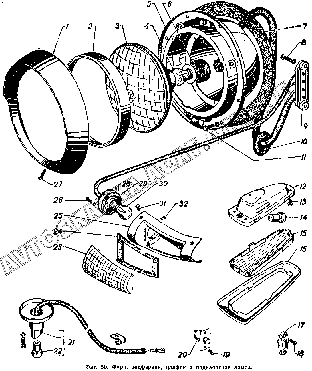 Фара, подфарник, плафон и подкапотная лампа ГАЗ 21 (М-21, М-21А, М-21В, М-21Д, М-21Е)