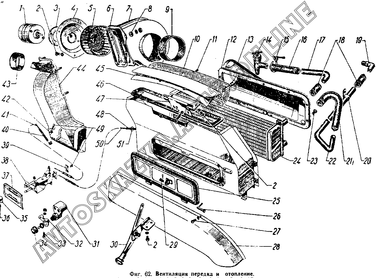 Вентиляция передка и отопление ГАЗ 21 (М-21, М-21А, М-21В, М-21Д, М-21Е)
