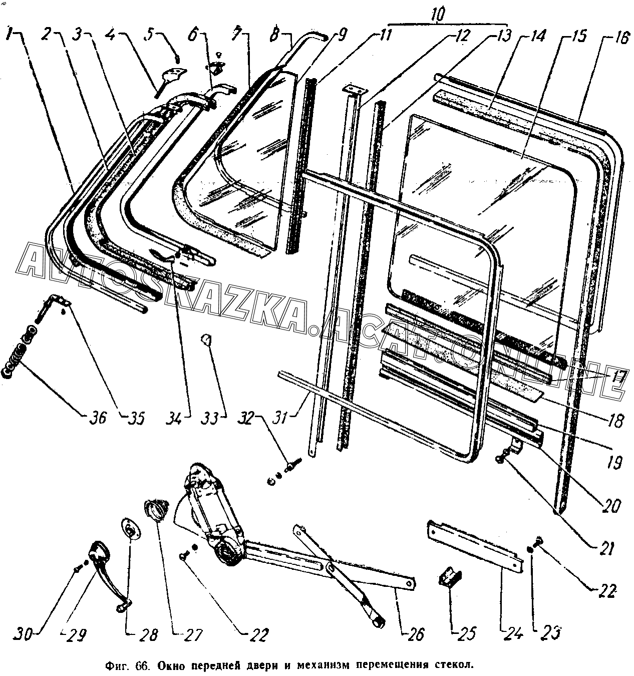 Окно передней двери и механизм перемещения стекол ГАЗ 21 (М-21, М-21А, М-21В, М-21Д, М-21Е)