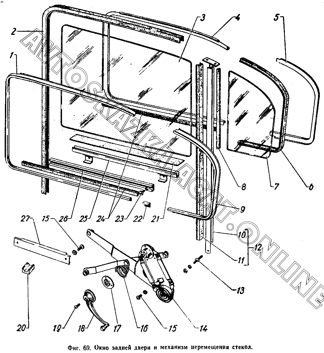 Окно задней двери и механизм перемещения стекол ГАЗ 21 (М-21, М-21А, М-21В, М-21Д, М-21Е)