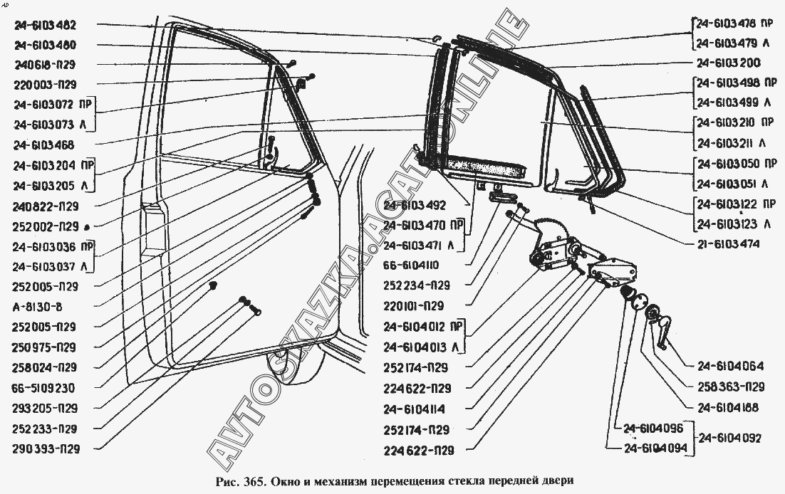 Окно и механизм перемещения стекла передней двери ГАЗ 24 (24-01, 24-02, 24-03, 24-04, 24-07)