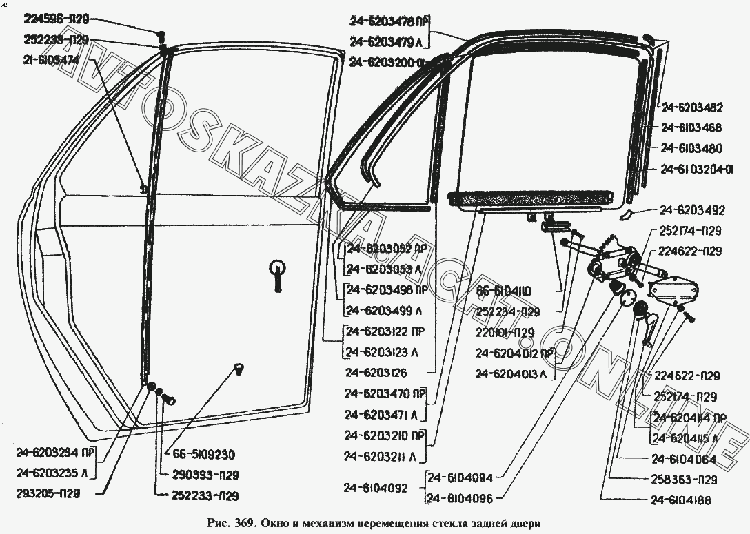 Окно и механизм перемещения стекла задней двери ГАЗ 24 (24-01, 24-02, 24-03, 24-04, 24-07)