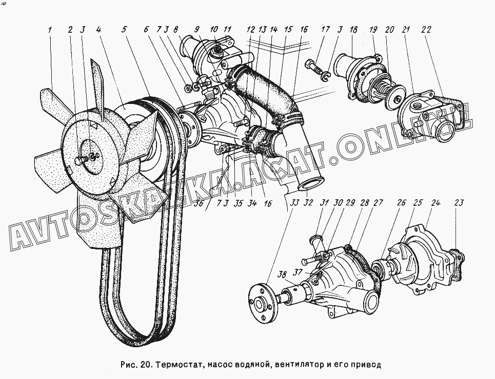 Термостат, насос водяной, вентилятор и его привод ГАЗ 24-10 (24-10, 24-11, 24-12, 24-13)
