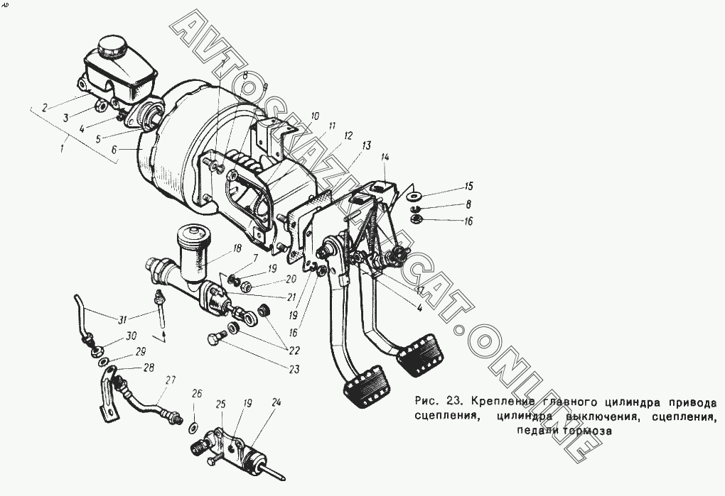 Крепление главного цилиндра привода сцепления, цилиндра выключения, педали тормоза ГАЗ 24-10 (24-10, 24-11, 24-12, 24-13)