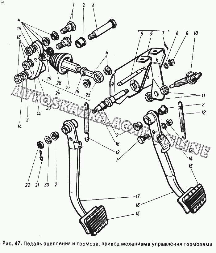 Педаль сцепления и тормоза, привод механизма управления тормозами ГАЗ 24-10 (24-10, 24-11, 24-12, 24-13)