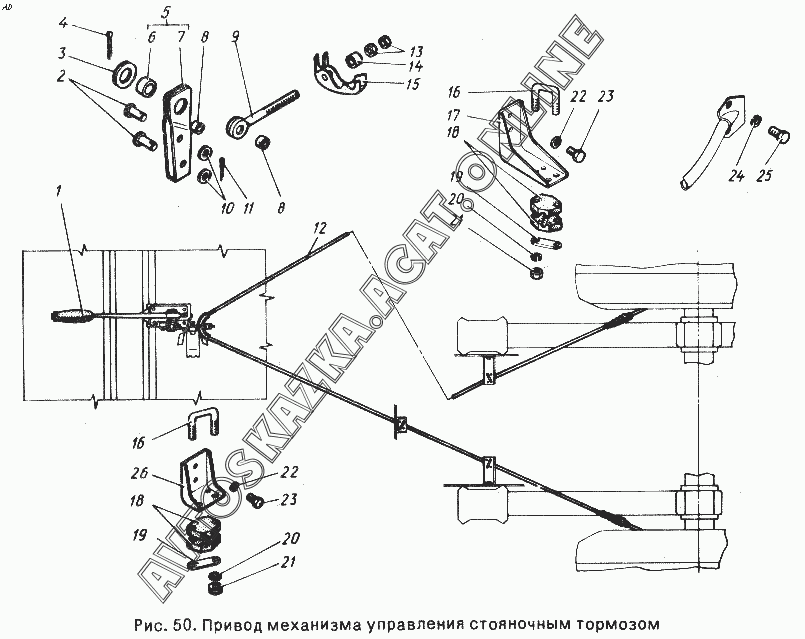 Привод механизма управления стояночным тормозом ГАЗ 24-10 (24-10, 24-11, 24-12, 24-13)
