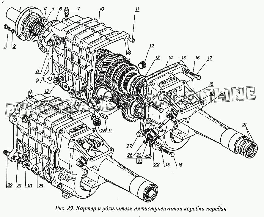 Картер и удлинитель со вторичным валом пятиступенчатой коробки передач ГАЗ 31029