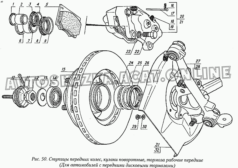 Ступицы передних колес, кулаки поворотные, тормоза рабочие передние (для автомобилей с передними дисковыми тормозами) ГАЗ 31029