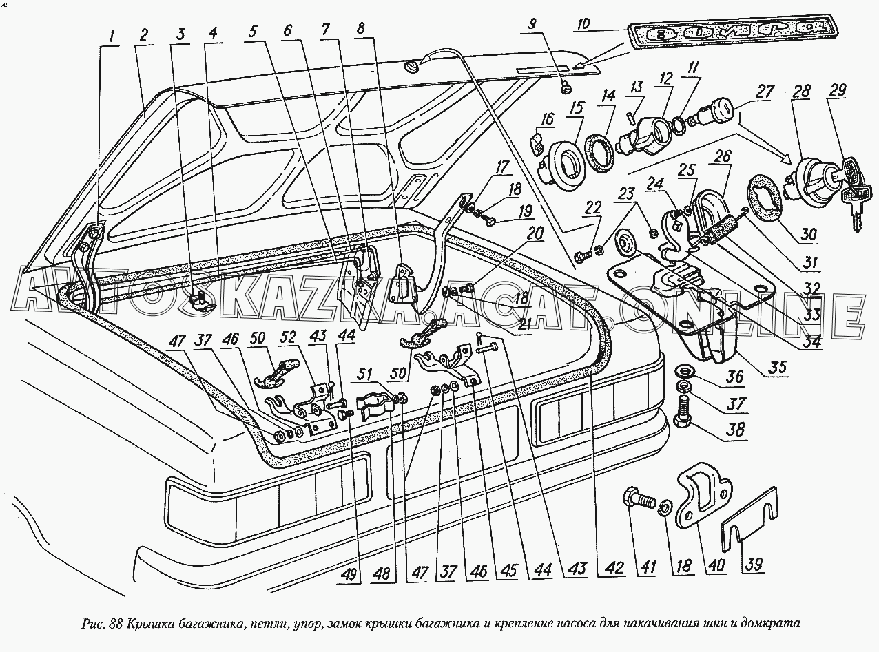 Крышка багажника, петли, упор, замок крышки багажника и крепление насоса для накачивания шин и домкрата ГАЗ 31029