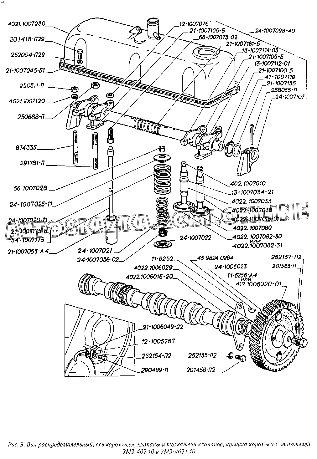 Вал распределительный, ось коромысел, клапаны и толкатели клапанов, крышка коромысел двигателей ЗМЗ-402.10 и ЗМЗ-4021.10 ГАЗ 3110 (3110-101, 3110-111, 3110-311, 3110-331, 3110-341, 3110-411, 3110-441)
