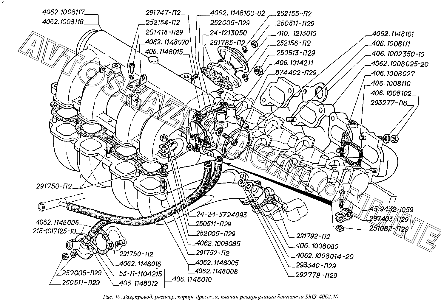 Газопровод, ресивер, корпус дросселя, клапан рециркуляции двигателя ЗМЗ-4062.10 ГАЗ 3110 (3110-101, 3110-111, 3110-311, 3110-331, 3110-341, 3110-411, 3110-441)