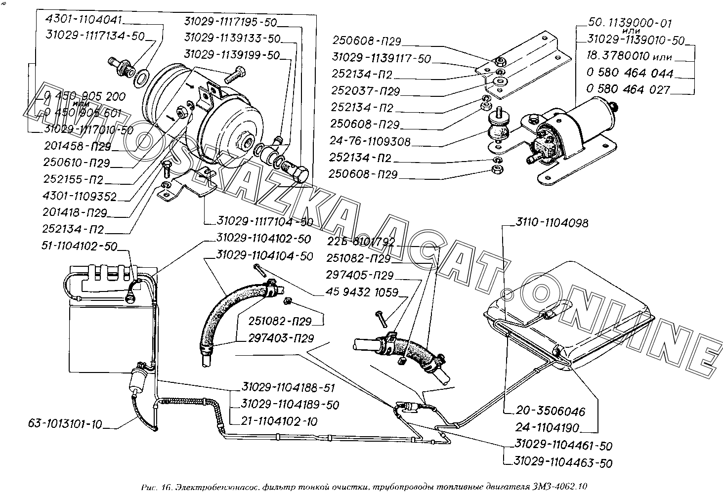 Электробензонасос, фильтр тонкой очистки, трубопроводы топливные двигателя ЗМЗ-4062.10 ГАЗ 3110 (3110-101, 3110-111, 3110-311, 3110-331, 3110-341, 3110-411, 3110-441)