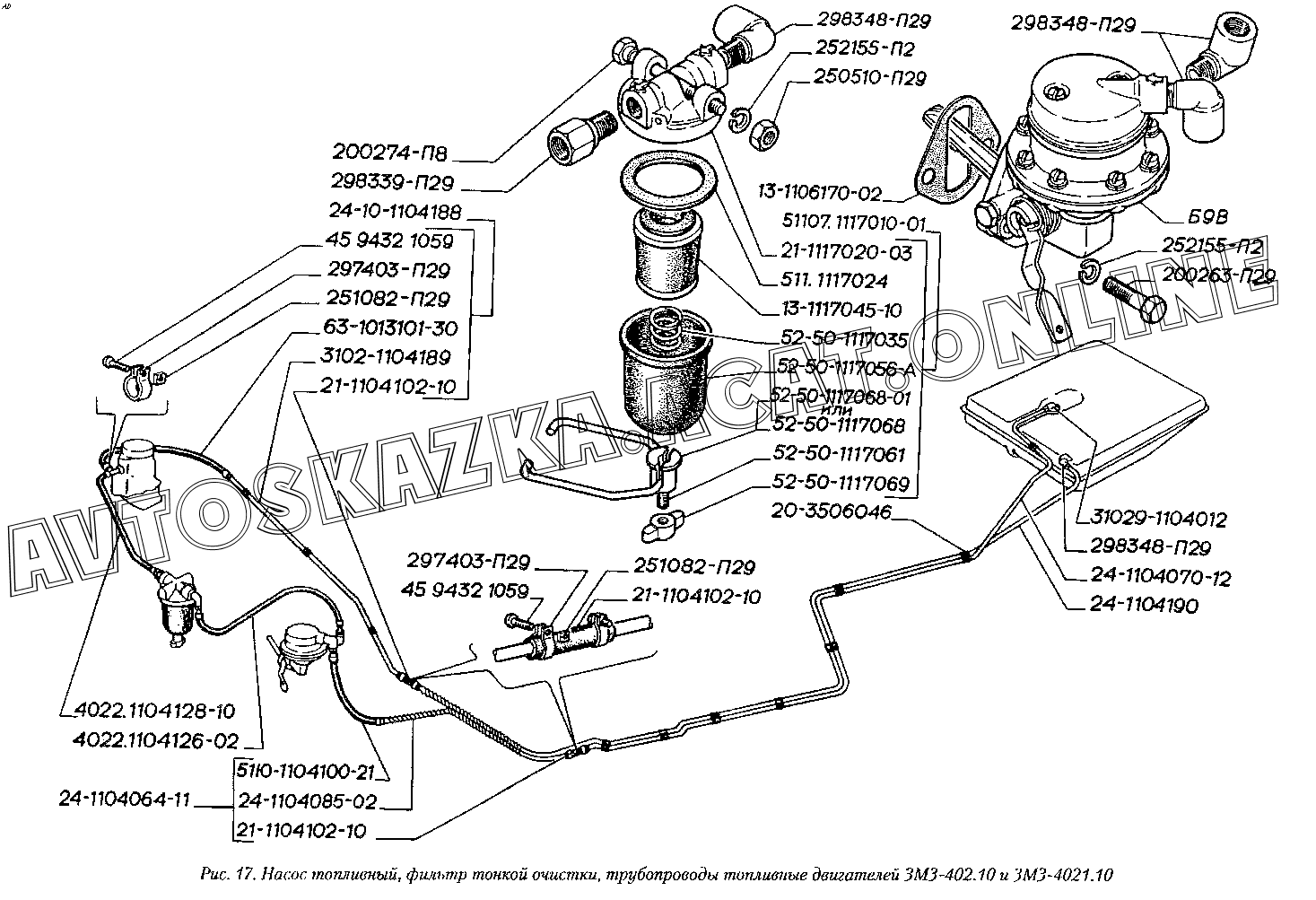 Насос топливный, фильтр тонкой очистки, трубопроводы топливные двигателей ЗМЗ-402.10 и ЗМЗ-4021.10 ГАЗ 3110 (3110-101, 3110-111, 3110-311, 3110-331, 3110-341, 3110-411, 3110-441)