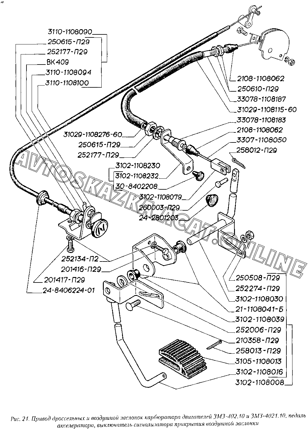 Привод дроссельных и воздушной заслонок карбюратора двигателей ЗМЗ-402.10 и ЗМЗ-4021.10, педаль акселератора, выключатель сигнализатора прикрытия воздушной заслонки ГАЗ 3110 (3110-101, 3110-111, 3110-311, 3110-331, 3110-341, 3110-411, 3110-441)