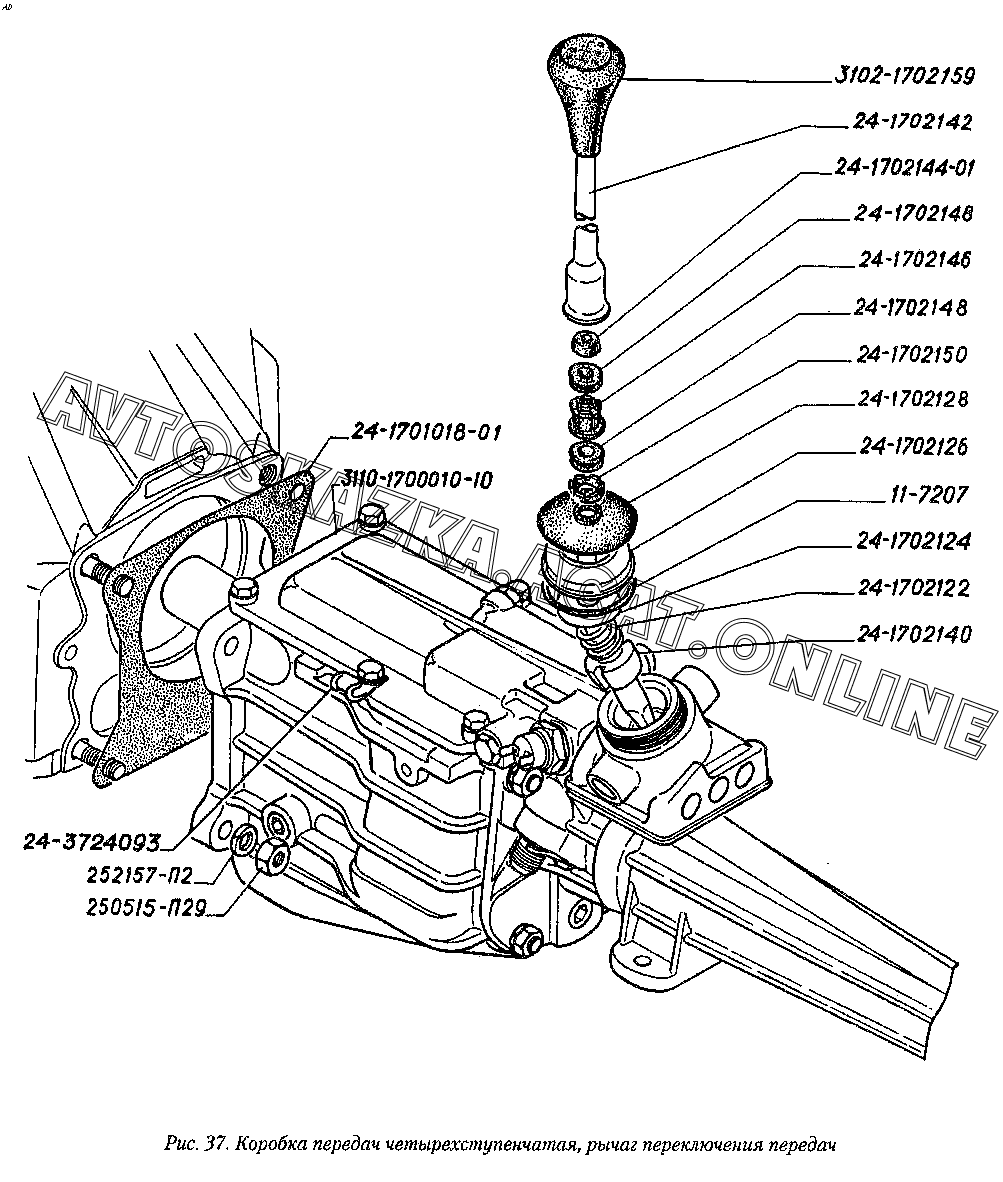 Коробка передач четырехступенчатая, рычаг переключения передач ГАЗ 3110 (3110-101, 3110-111, 3110-311, 3110-331, 3110-341, 3110-411, 3110-441)