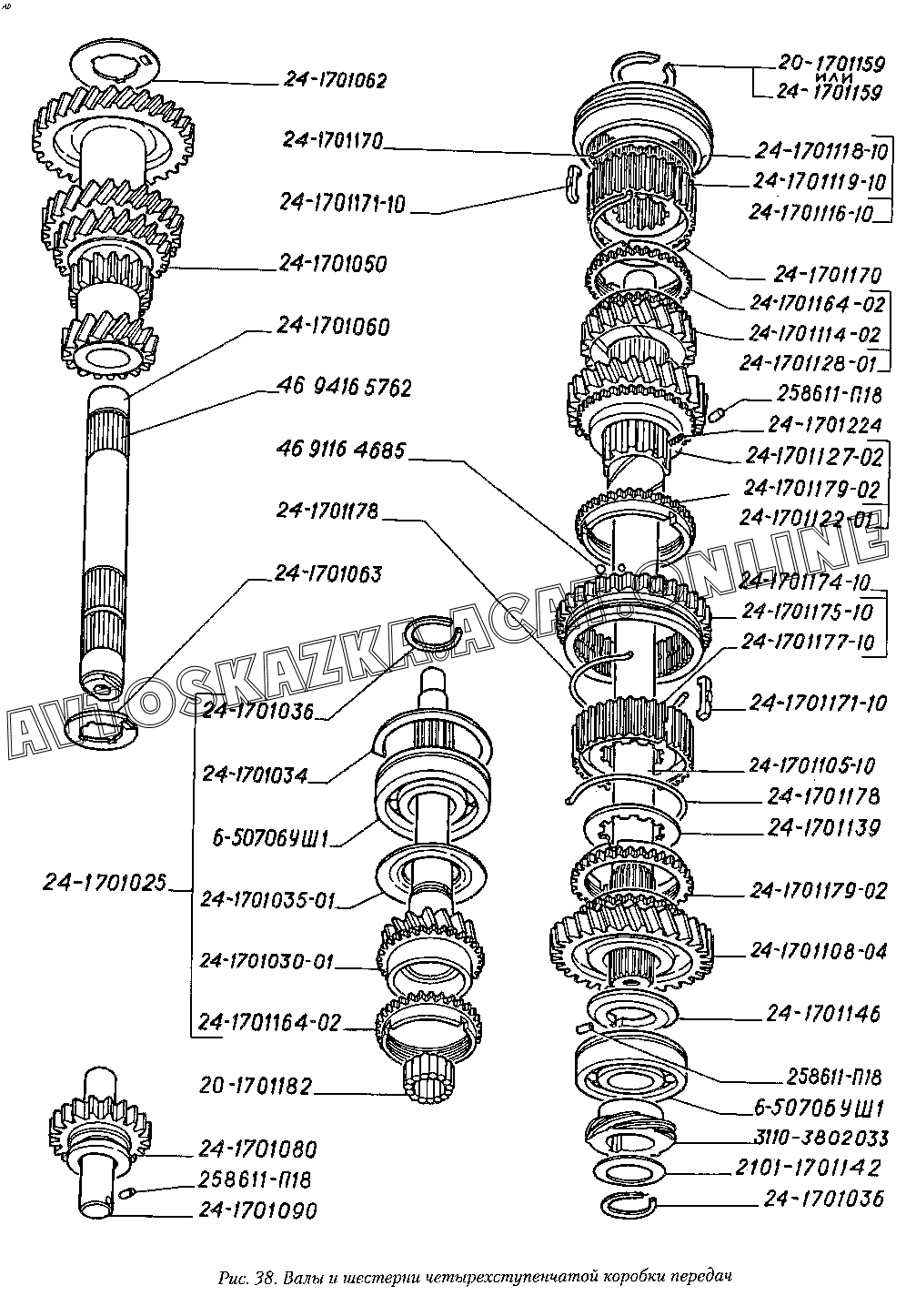Валы и шестерни четырехступенчатой коробки передач ГАЗ 3110 (3110-101, 3110-111, 3110-311, 3110-331, 3110-341, 3110-411, 3110-441)
