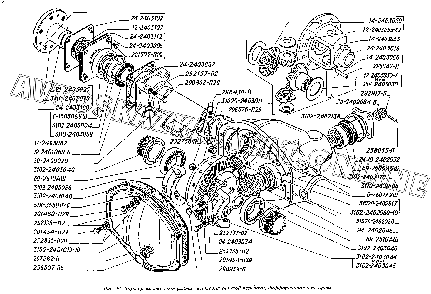 Картер моста с кожухами, шестерни главной передачи, дифференциал и полуоси ГАЗ 3110 (3110-101, 3110-111, 3110-311, 3110-331, 3110-341, 3110-411, 3110-441)