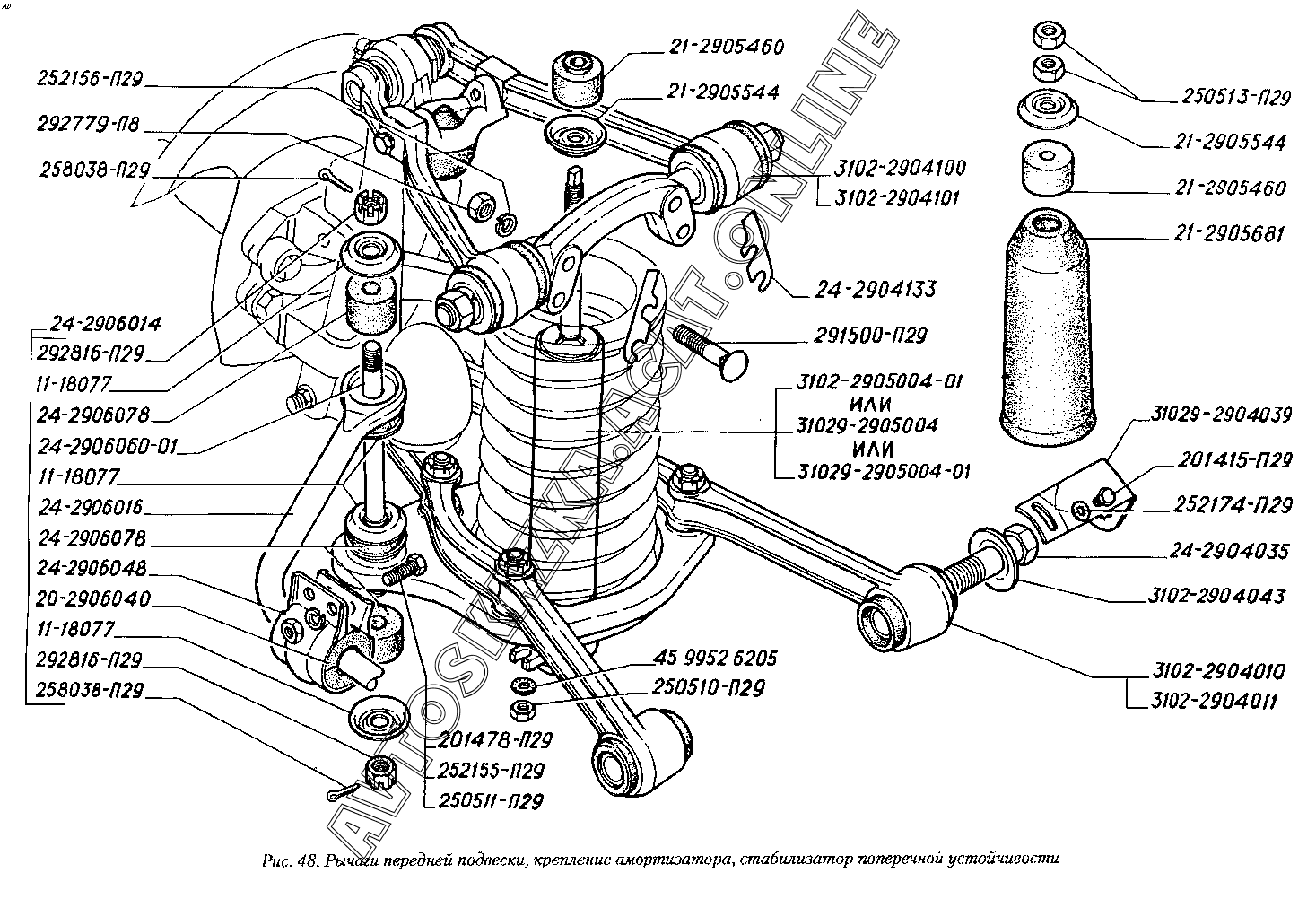 Рычаги передней подвески, крепление амортизатора, стабилизатор поперечной устойчивости ГАЗ 3110 (3110-101, 3110-111, 3110-311, 3110-331, 3110-341, 3110-411, 3110-441)