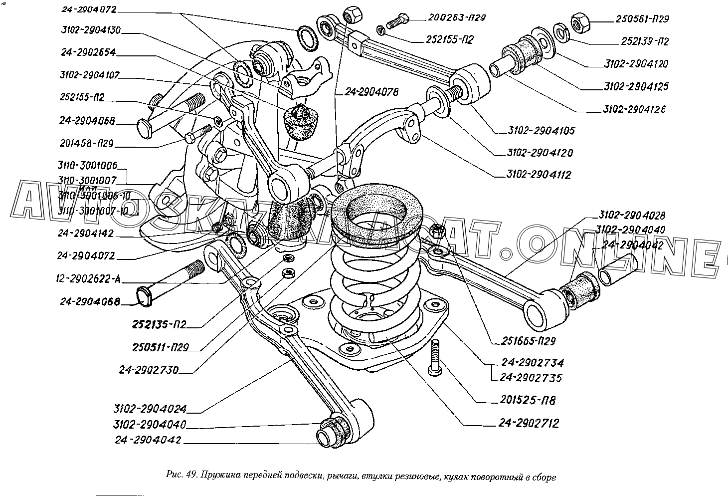 Пружина передней подвески, рычаги, втулки резиновые, кулак поворотный в сборе ГАЗ 3110 (3110-101, 3110-111, 3110-311, 3110-331, 3110-341, 3110-411, 3110-441)