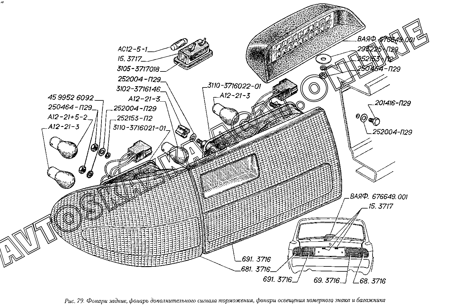 Фонари задние, фонарь дополнительного сигнала торможения, фонари освещения номерного знака и багажника ГАЗ 3110 (3110-101, 3110-111, 3110-311, 3110-331, 3110-341, 3110-411, 3110-441)