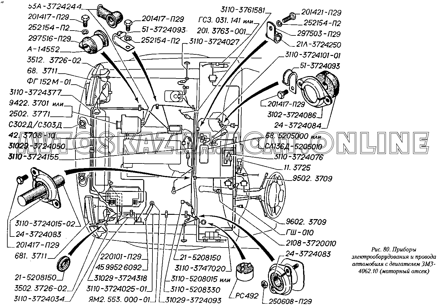 Приборы электрооборудования и провода автомобиля с двигателем ЗМЗ-4062.10 (моторный отсек) ГАЗ 3110 (3110-101, 3110-111, 3110-311, 3110-331, 3110-341, 3110-411, 3110-441)
