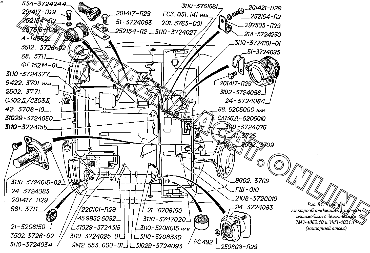 Приборы электрооборудования и провода автомобиля с двигателями ЗМЗ-4062.10 и ЗМЗ-4021.10 (моторный отсек) ГАЗ 3110 (3110-101, 3110-111, 3110-311, 3110-331, 3110-341, 3110-411, 3110-441)