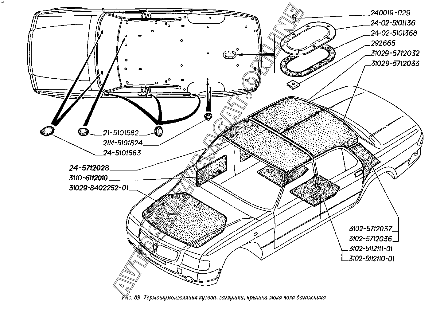 Термошумоизоляция кузова, заглушки, крышка люка пола багажника ГАЗ 3110 (3110-101, 3110-111, 3110-311, 3110-331, 3110-341, 3110-411, 3110-441)