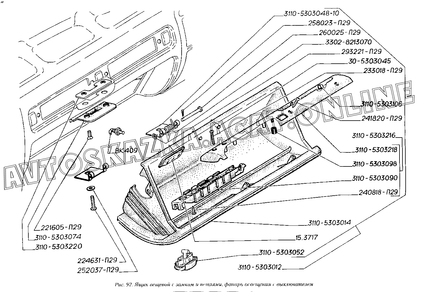 Ящик вещевой с замком и петлями, фонарь освещения с выключателем ГАЗ 3110 (3110-101, 3110-111, 3110-311, 3110-331, 3110-341, 3110-411, 3110-441)