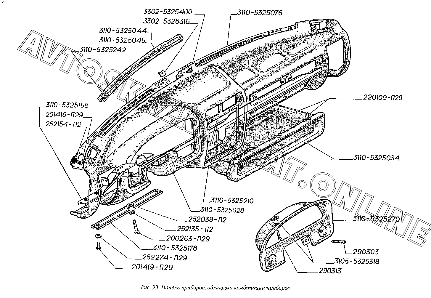 Панель приборов, облицовка комбинации приборов ГАЗ 3110 (3110-101, 3110-111, 3110-311, 3110-331, 3110-341, 3110-411, 3110-441)