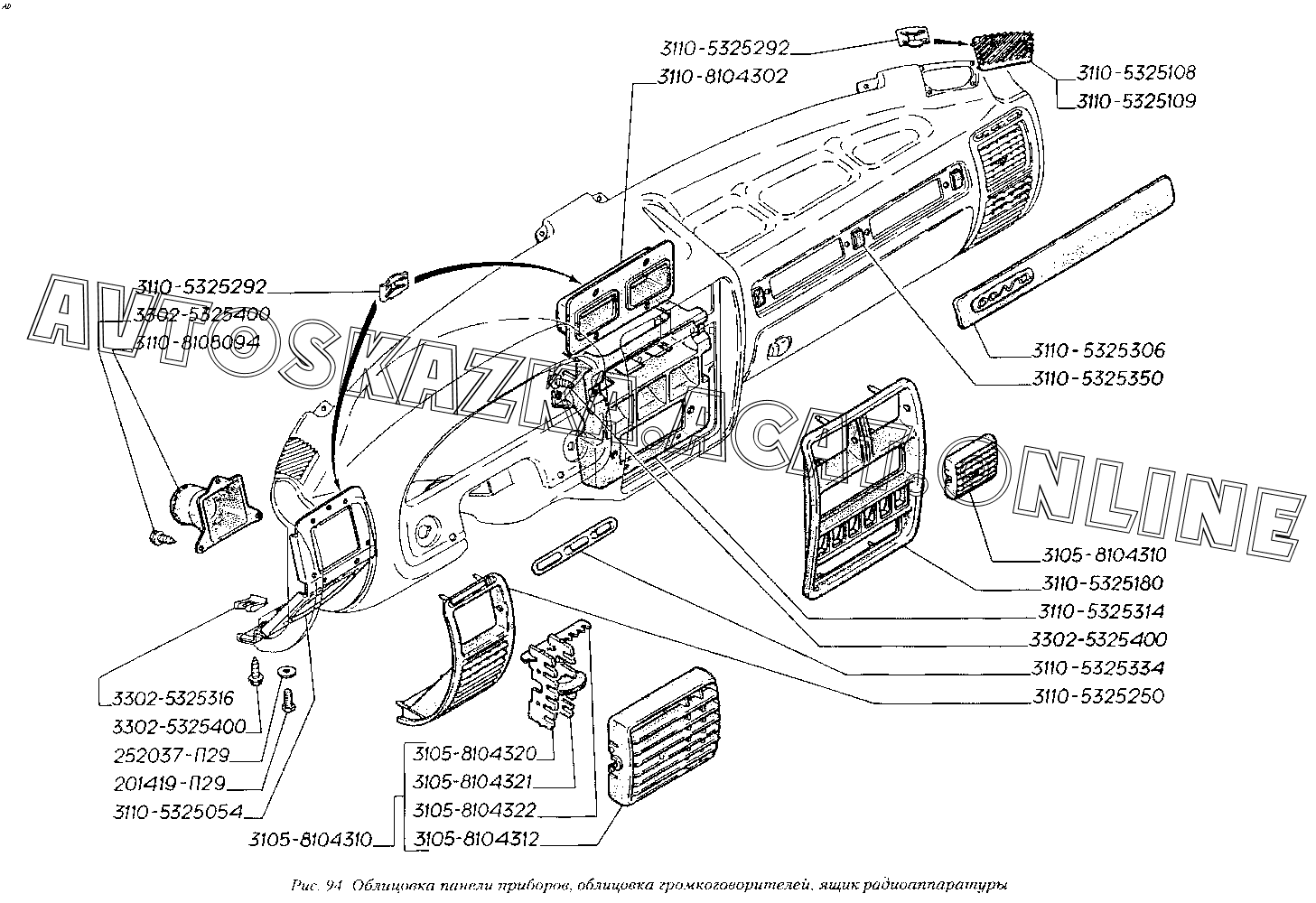 Облицовка панели приборов, облицовка громкоговорителей, ящик радиоаппаратуры ГАЗ 3110 (3110-101, 3110-111, 3110-311, 3110-331, 3110-341, 3110-411, 3110-441)
