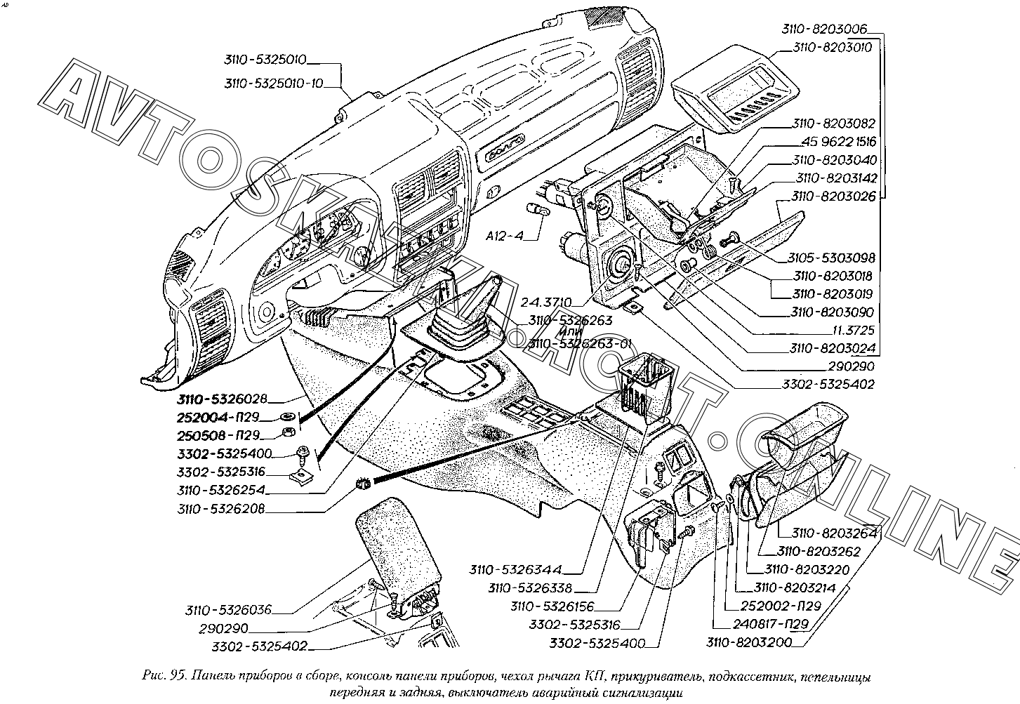 Панель приборов в сборе, консоль панели приборов, чехол рычага КП, прикуриватель, подкассетник, пепельницы передняя и задняя, выключатель аварийный сигнализации ГАЗ 3110 (3110-101, 3110-111, 3110-311, 3110-331, 3110-341, 3110-411, 3110-441)