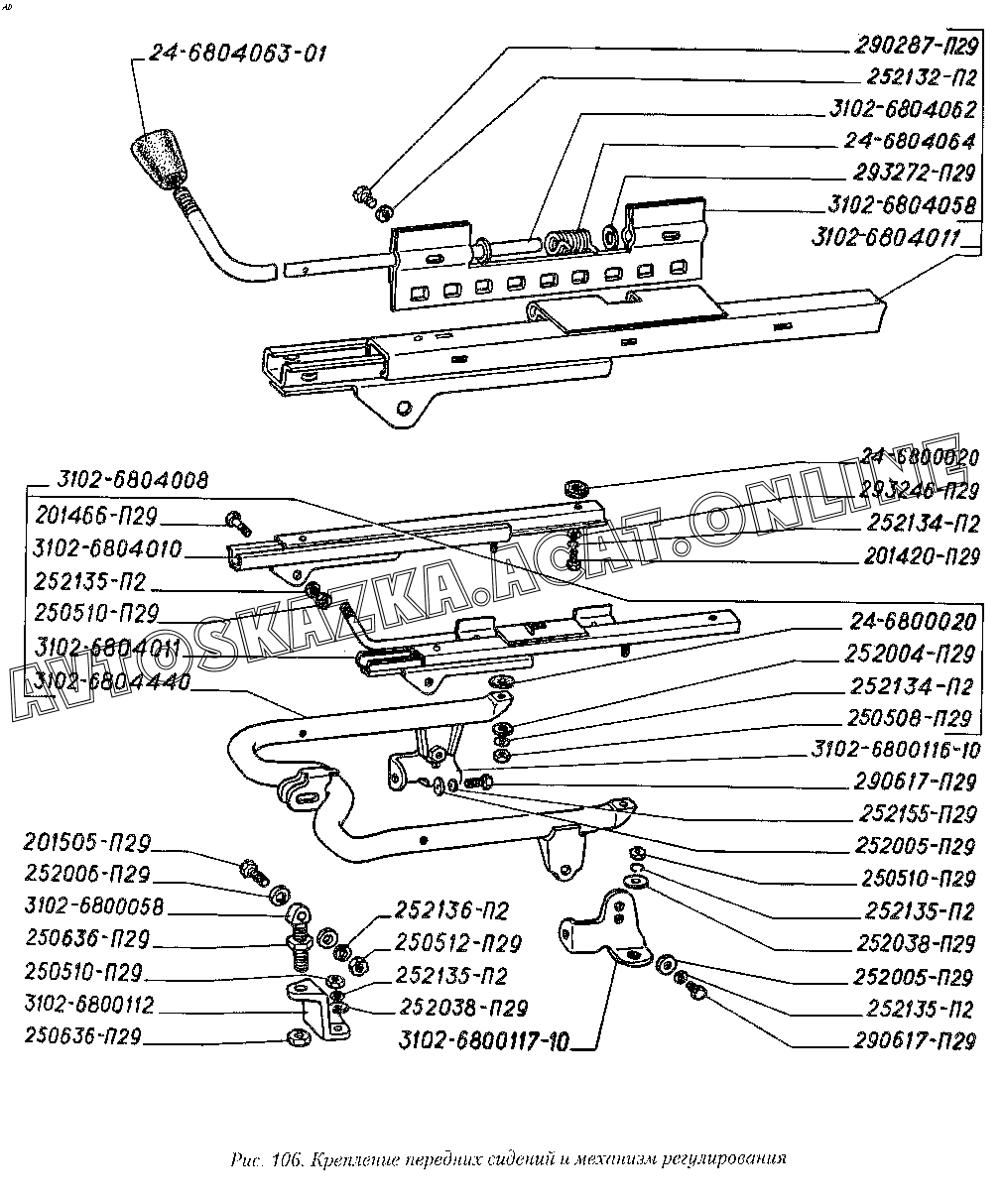Крепление передних сидений и механизм регулирования ГАЗ 3110 (3110-101, 3110-111, 3110-311, 3110-331, 3110-341, 3110-411, 3110-441)