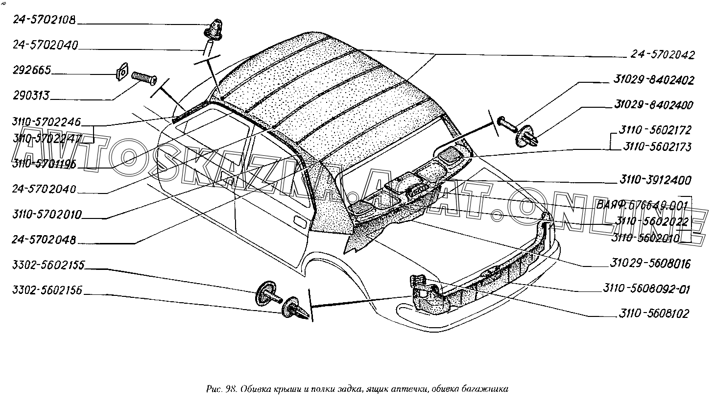 Обивка крыши и полки задка, ящик аптечки, обивка багажника ГАЗ 3110 (3110-101, 3110-111, 3110-311, 3110-331, 3110-341, 3110-411, 3110-441)