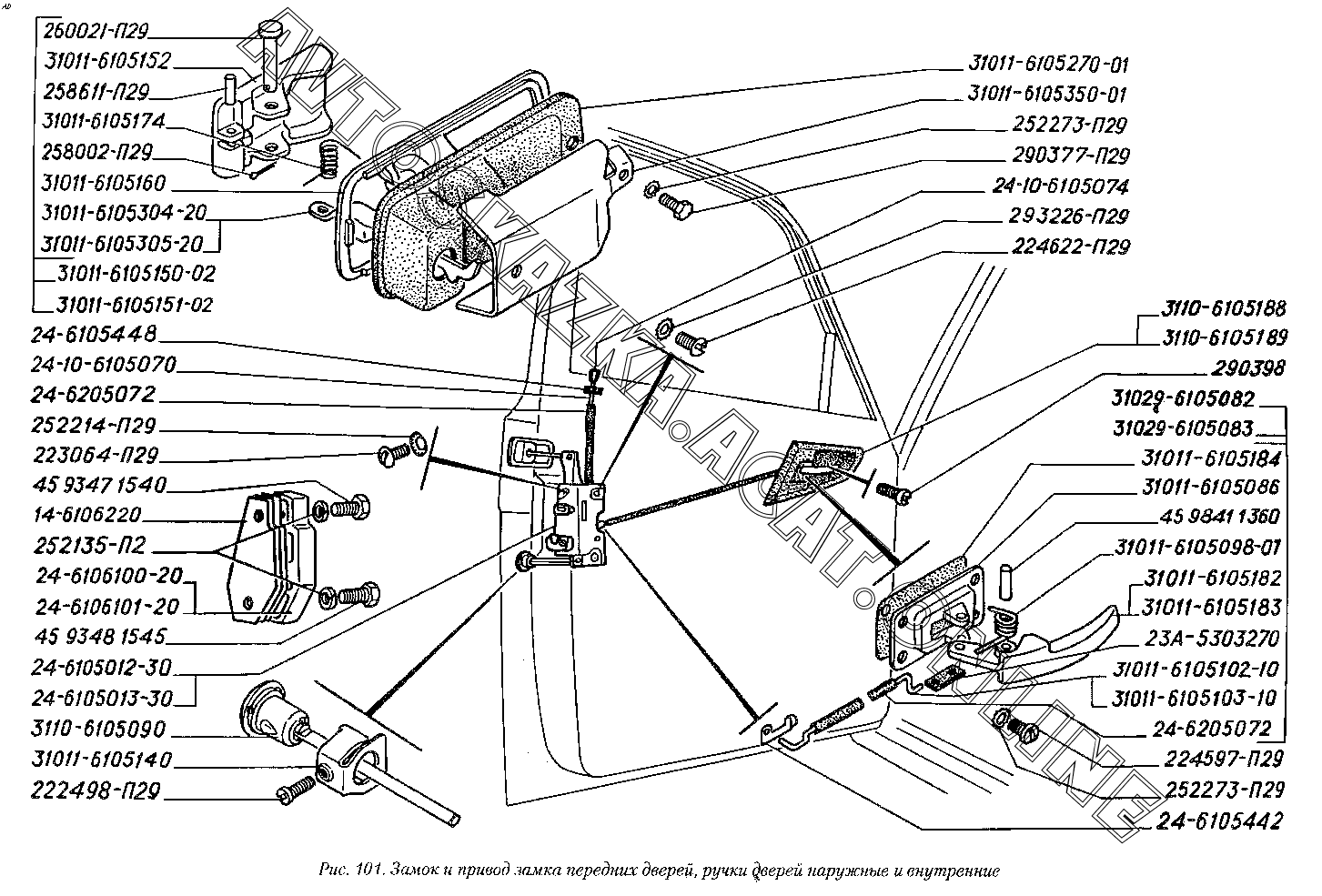 Замок и привод замка передних дверей, ручки дверей наружные и внутренние ГАЗ 3110 (3110-101, 3110-111, 3110-311, 3110-331, 3110-341, 3110-411, 3110-441)