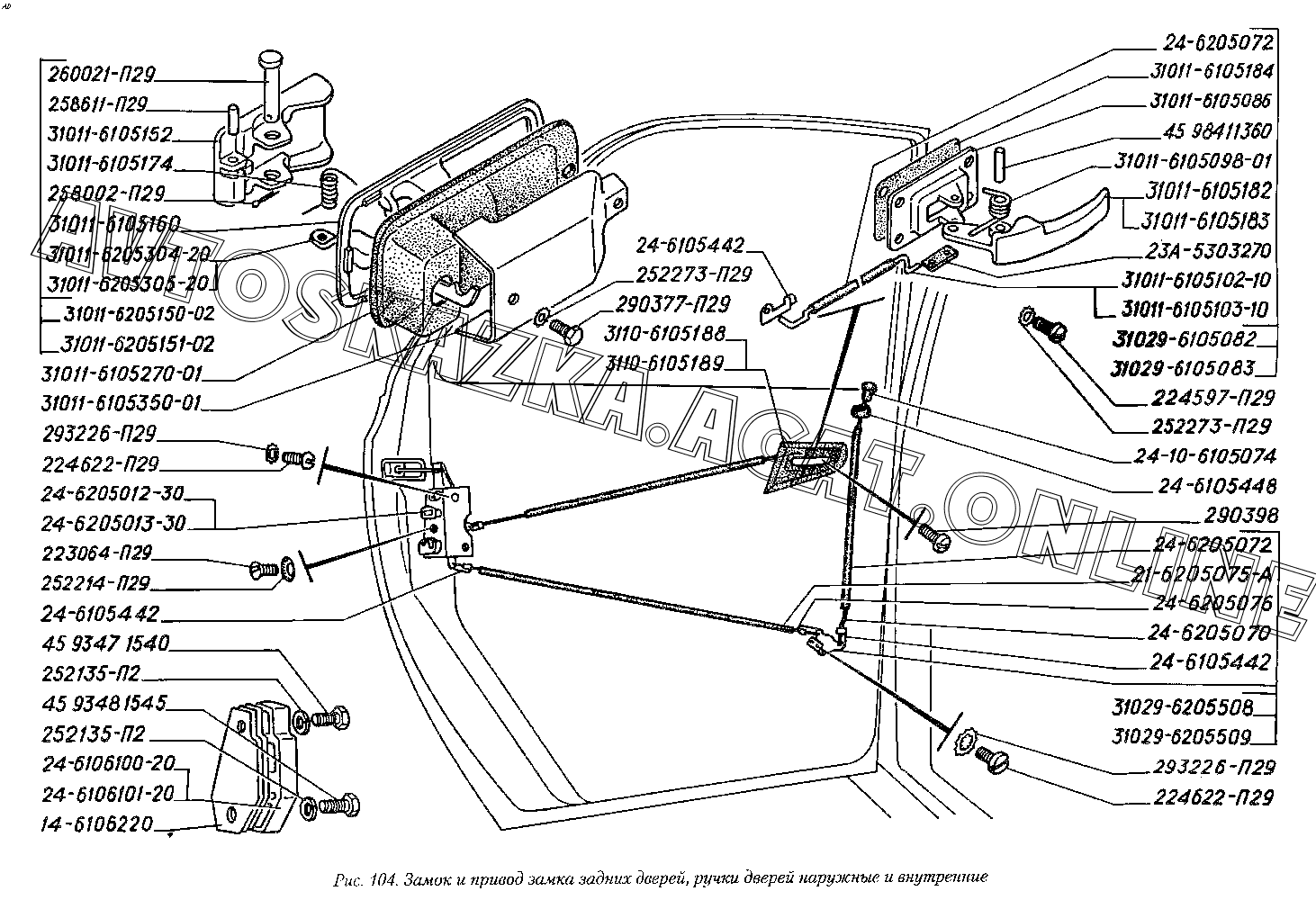 Замок и привод замка задних дверей, ручки дверей наружные и внутренние ГАЗ 3110 (3110-101, 3110-111, 3110-311, 3110-331, 3110-341, 3110-411, 3110-441)