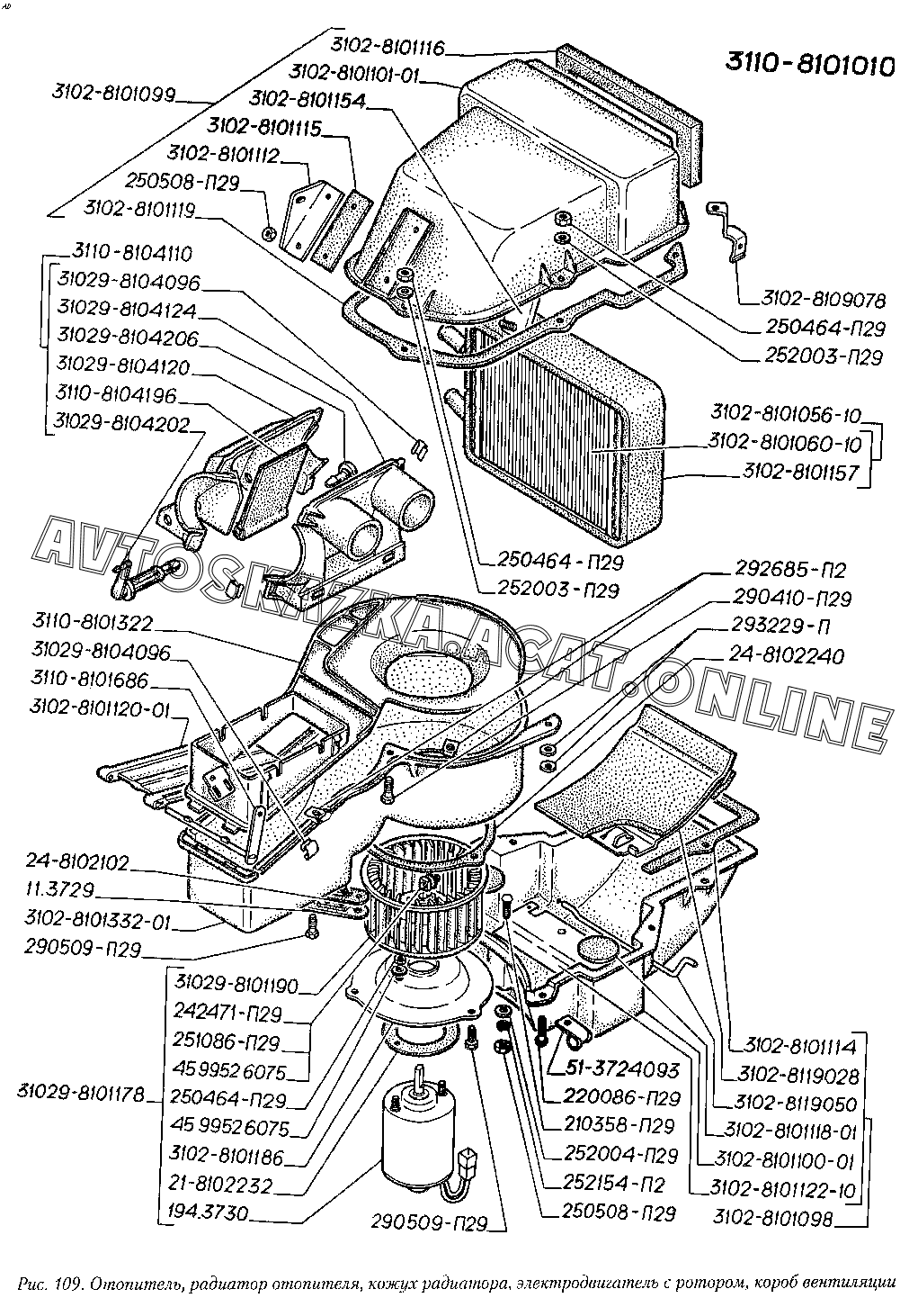 Отопитель, радиатор отопителя, кожух радиатора, электродвигатель с ротором, короб вентиляции ГАЗ 3110 (3110-101, 3110-111, 3110-311, 3110-331, 3110-341, 3110-411, 3110-441)