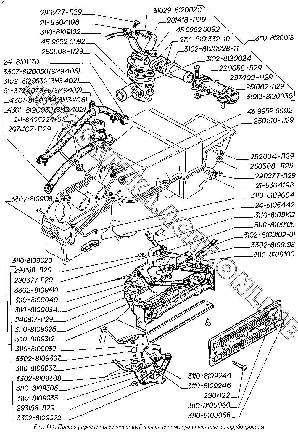 Привод управления вентиляцией и отоплением, кран отопителя, трубопроводы ГАЗ 3110 (3110-101, 3110-111, 3110-311, 3110-331, 3110-341, 3110-411, 3110-441)