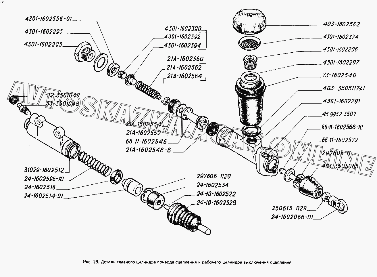 Детали главного цилиндра привода сцепления и рабочего цилиндра выключения сцепления ГАЗ 3302 (33021)