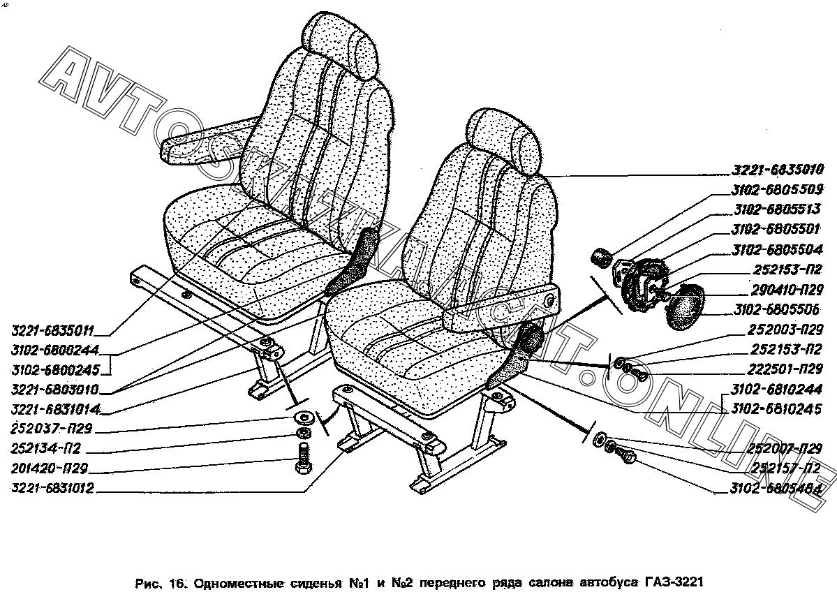 Одноместные сиденья № 1 и № 2 переднего ряда салона автобуса ГАЗ-3221 ГАЗ 3221 (3221-000012, 3221-000014, 3221-000024, 32213, 32213-000012, 32213-000014, 32213-000024)