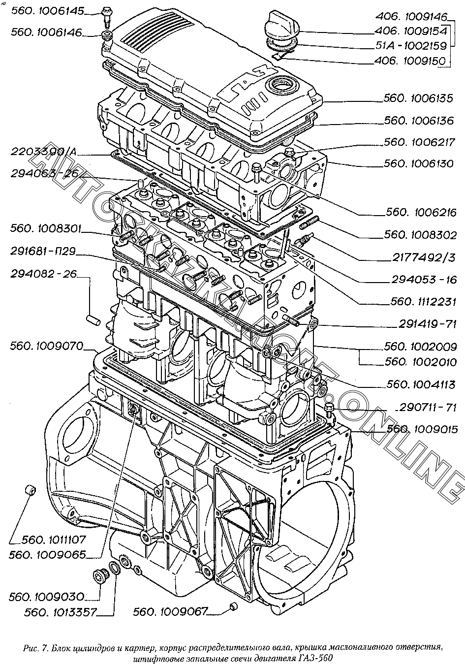 Блок цилиндров и картер, корпус распределительного вала, крышка маслоналивного отверстия, штифтовые запальные свечи двигателя ГАЗ-560 ГАЗ 2217 (22171)