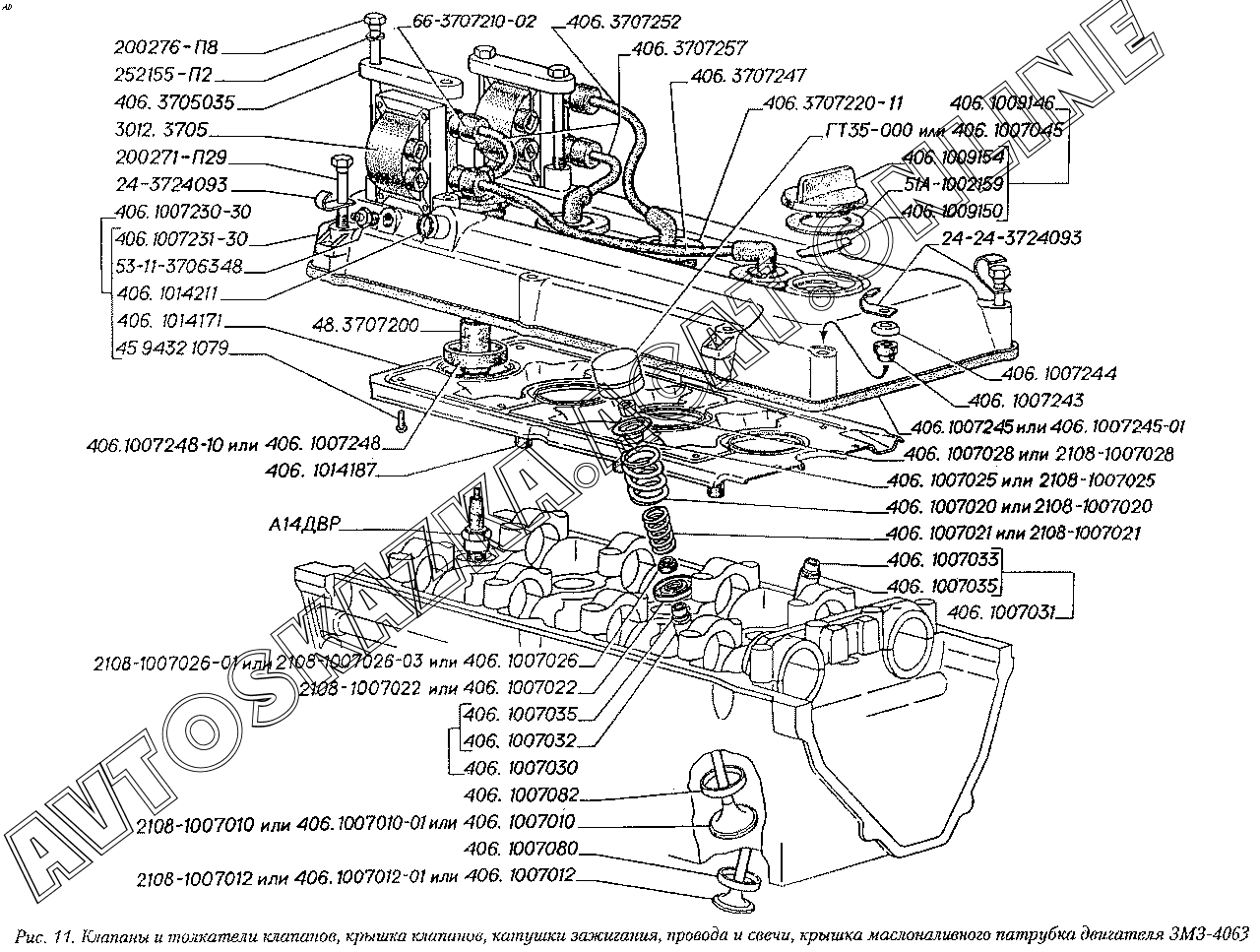 Клапаны и толкатели клапанов, крышка клапанов, катушки зажигания, провода и свечи, крышка маслоналивного патрубка двигателя ЗМЗ-4063