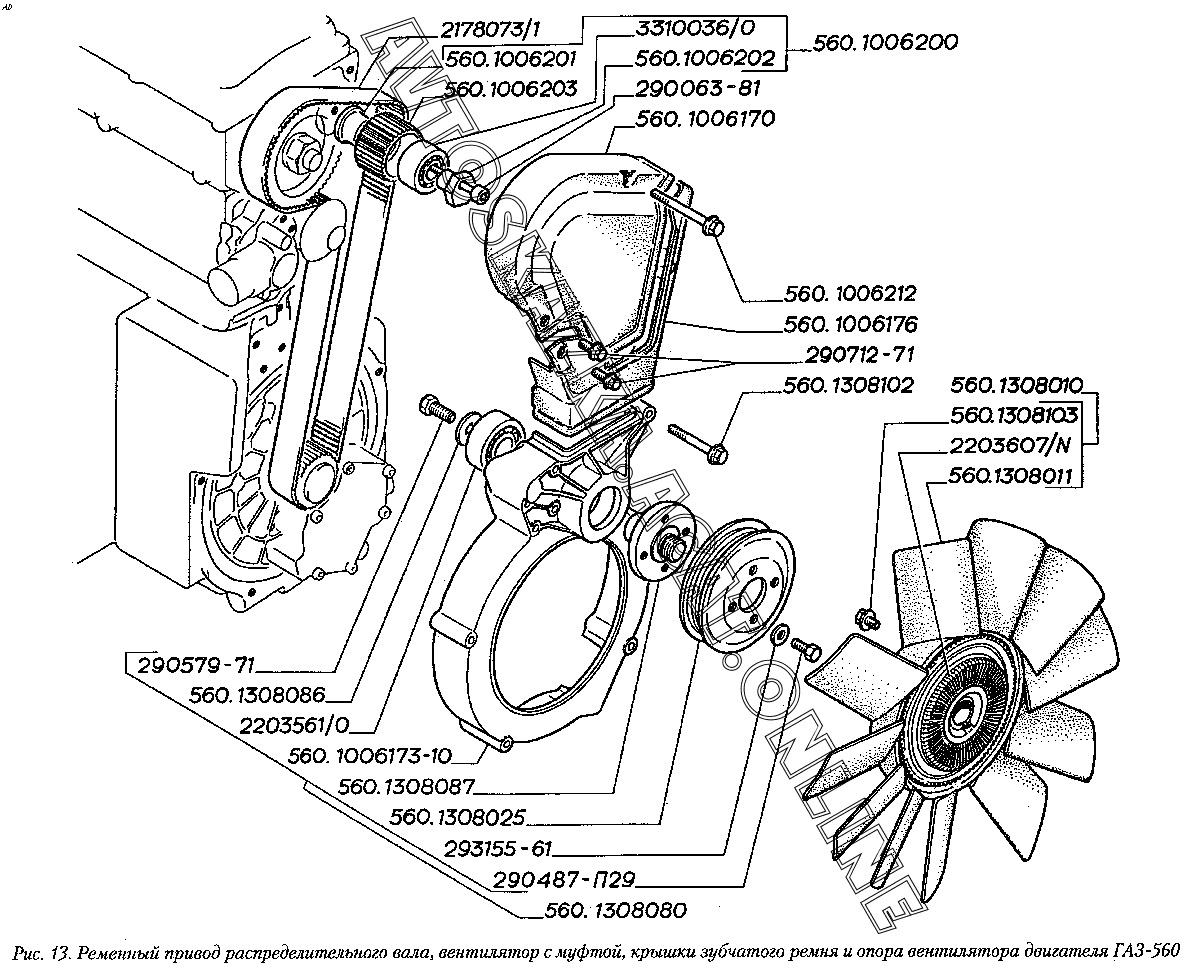 Ременный привод распределительного вала, вентилятор с муфтой, крышки зубчатого ремня и опора вентилятора двигателя ГАЗ-560 ГАЗ 2217 (22171)