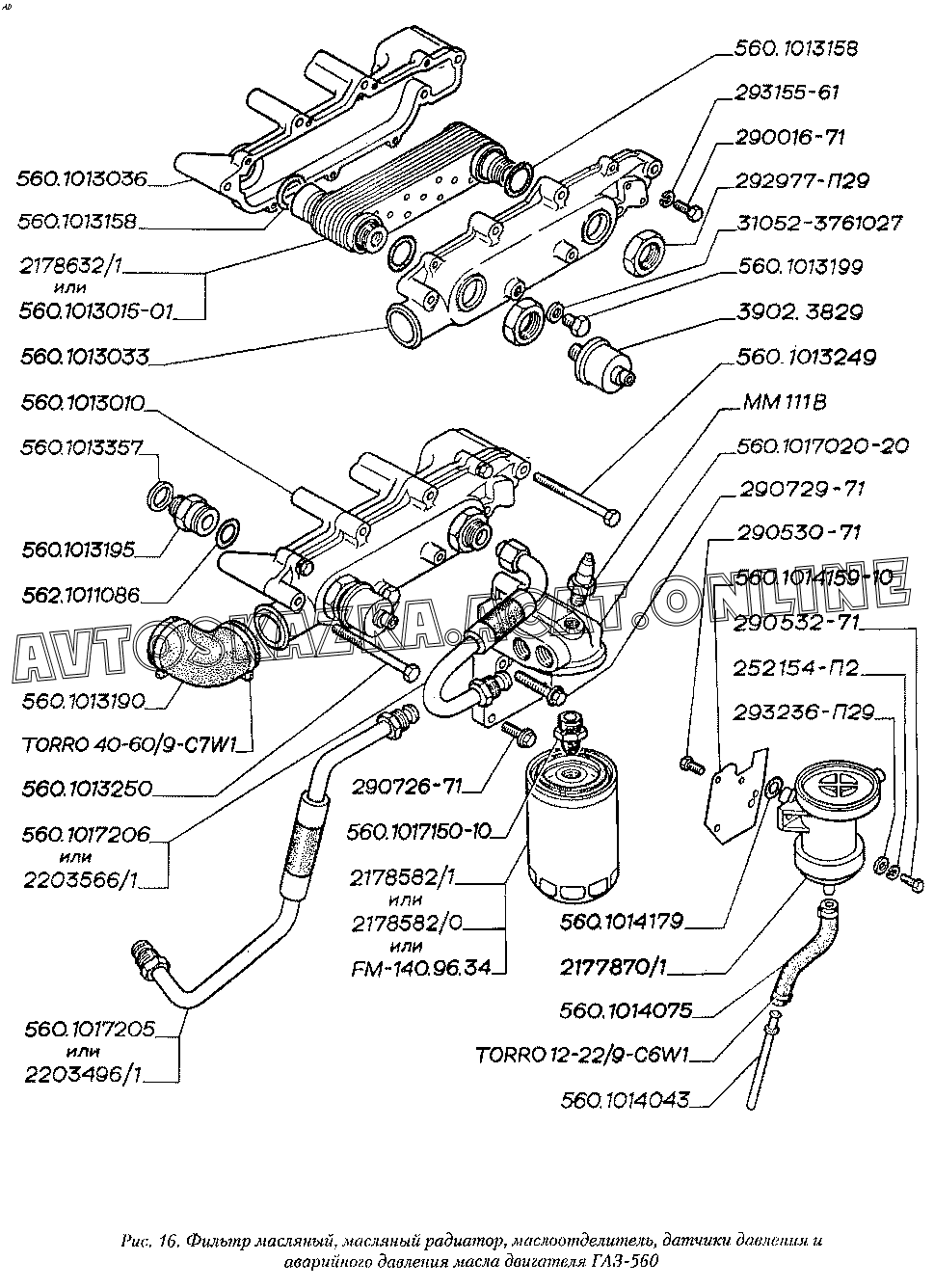 Фильтр масляный, масляный радиатор, маслоотделитель, датчики давления и аварийного давления масла двигателя ГАЗ-560