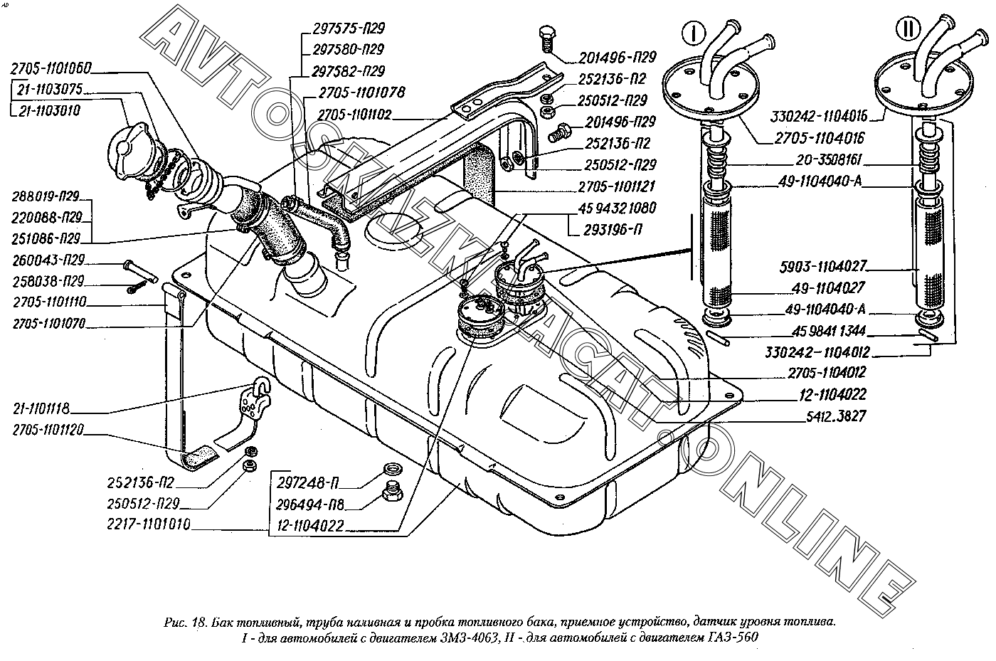 Бак топливный, труба наливная и пробка топливного бака, приемное устройство, датчик уровня топлива. I - для автомобилей с двигателем ЗМЗ-4063, II - для автомобилей с двигателем ГАЗ-560