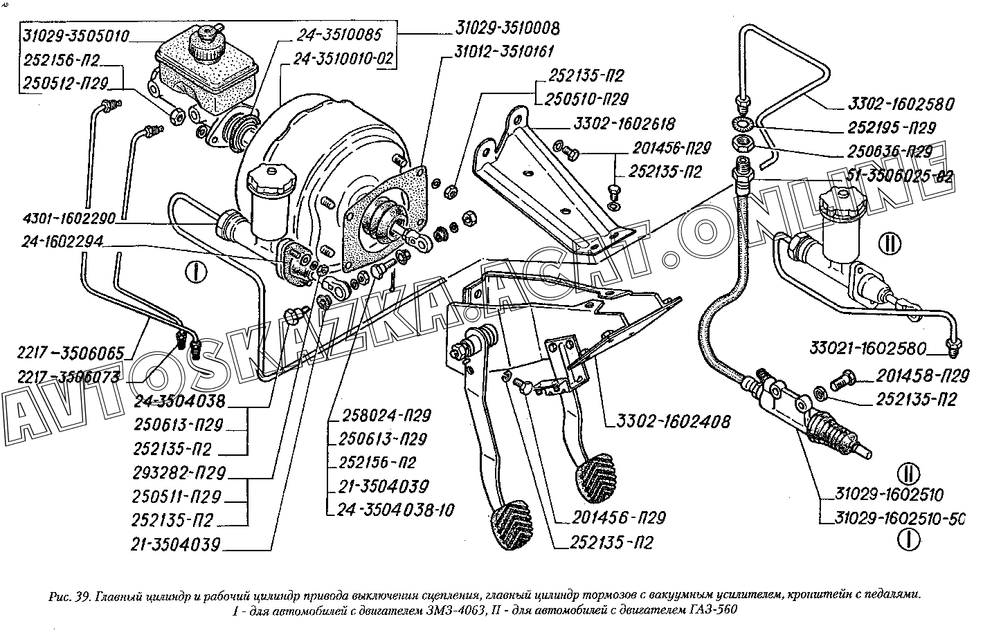 Главный цилиндр и рабочий цилиндр привода выключения сцепления, главный цилиндр тормозов с вакуумным усилителем, кронштейн с педалями. I - для автомобилей с двигателем ЗМЗ-4063, II - для автомобилей с двигателем ГАЗ-560
