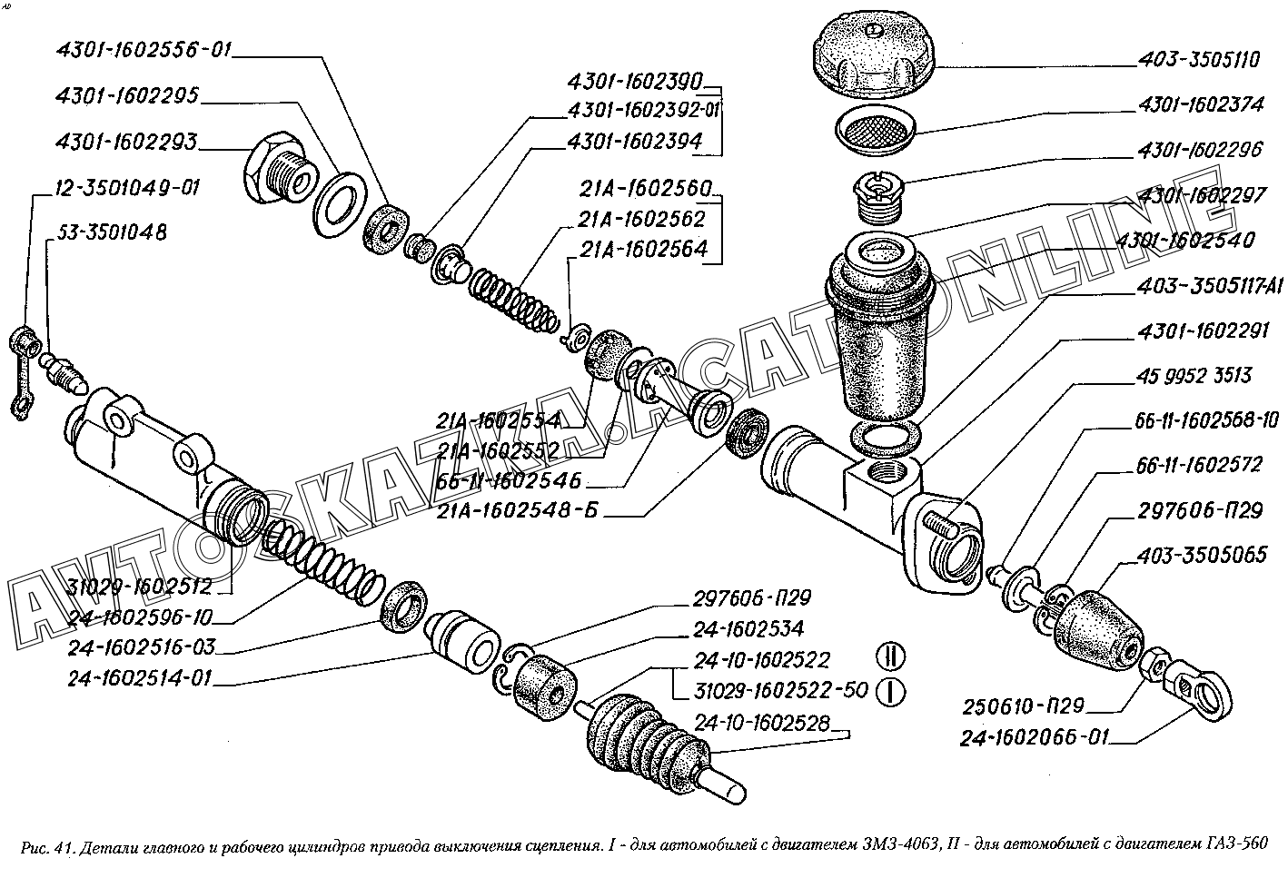 Детали главного и рабочего цилиндров привода выключения сцепления. I - для автомобилей с двигателем ЗМЗ-4063, II - для автомобилей с двигателем ГАЗ-560