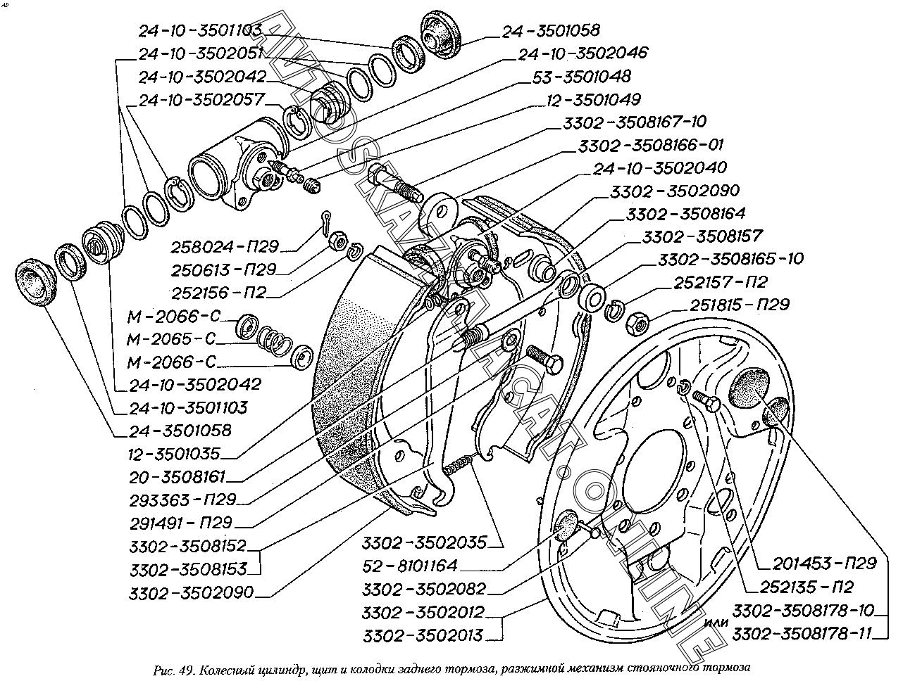 Колесный цилиндр, щит и колодки заднего тормоза, разжимной механизм стояночного тормоза ГАЗ 2217 (22171)