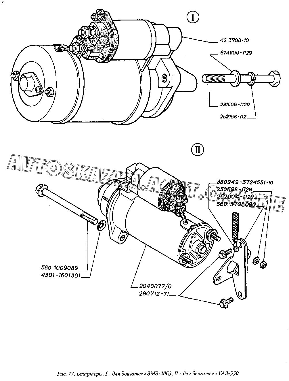 Стартеры. I - для двигателя ЗМЗ-4063, II - для двигателя ГАЗ-560 ГАЗ 2217 (22171)