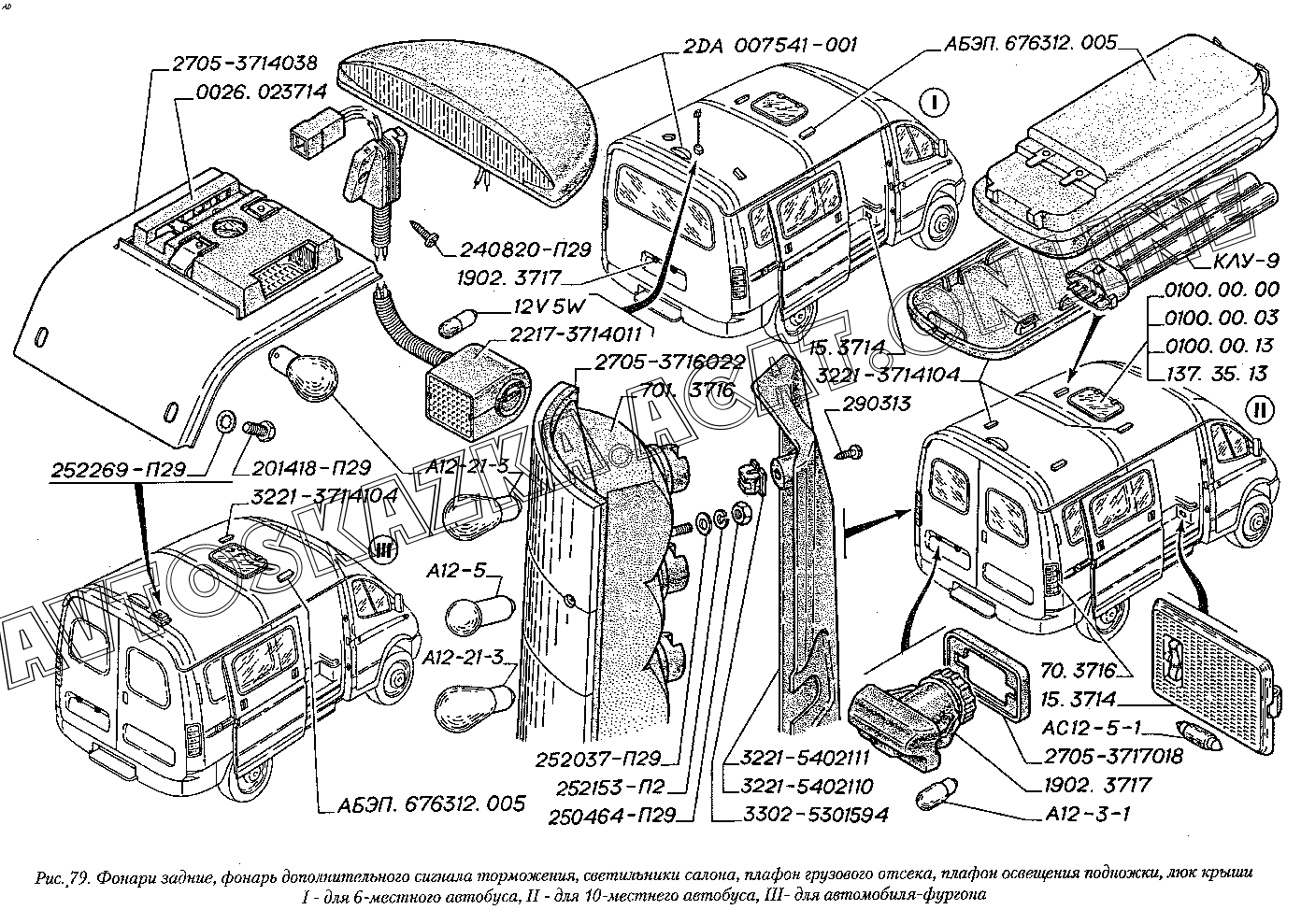 Фонари задние, фонарь дополнительного сигнала торможения, светильники салона, плафон грузового отсека, плафон освещения подножки, люк крыши I - для 6-местно-го автобуса, II - для 10-местного автобуса, III- для автомобиля-фургона